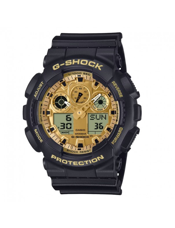 Reloj Casio G-SHOCK GA-100GGB-1A9ER. Caja y correa de resina negra resistente y acabados espejados dorados. Esfera analógica-digital con detalles dorados por deposición de vapor y pantalla LCD con efecto espejo. Movimiento de cuarzo, resistente a impactos y agua hasta 20 bar. Ideal para un look atrevido y deportivo. Garantía de 3 años.