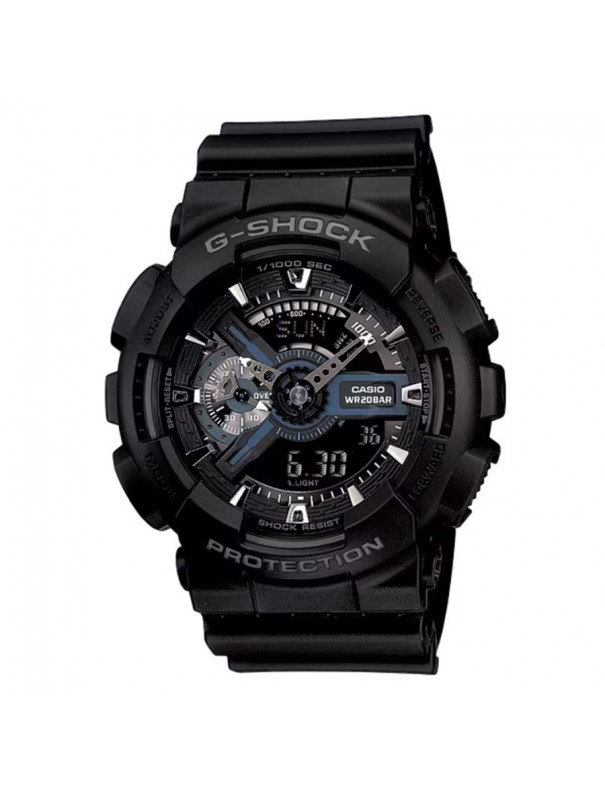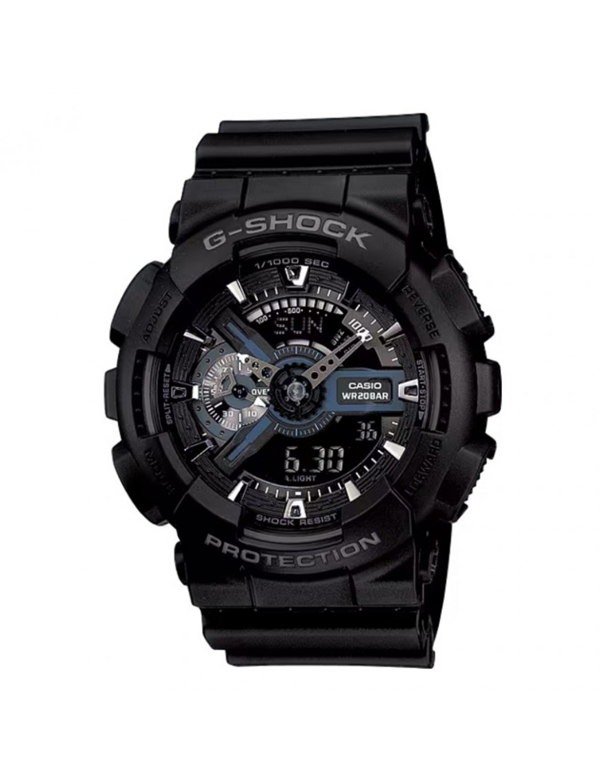Reloj CASIO G-SHOCK Classic GA-110-1BER. Caja de resina negra con esfera negro-plateada y correa de resina negra con cierre de hebilla. Funciona con movimiento de cuarzo y ofrece cronómetro de 1/1000 s, temporizador, hora mundial, 5 alarmas, velocidad, calendario automático y luz LED. Es resistente a golpes, campos magnéticos y al agua hasta 20 bar.