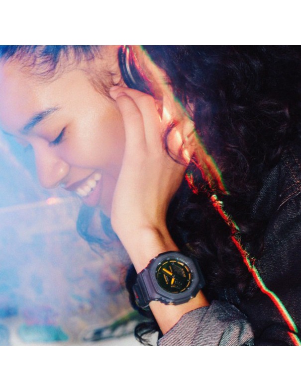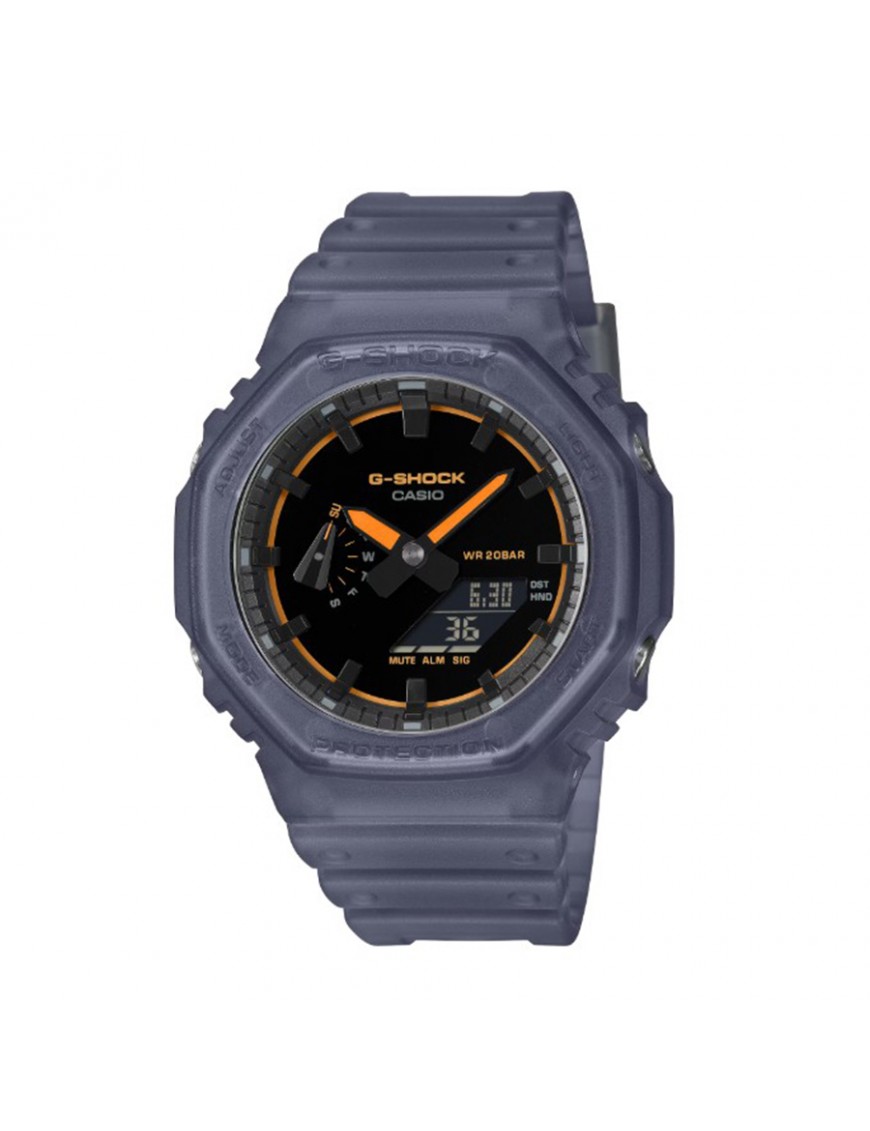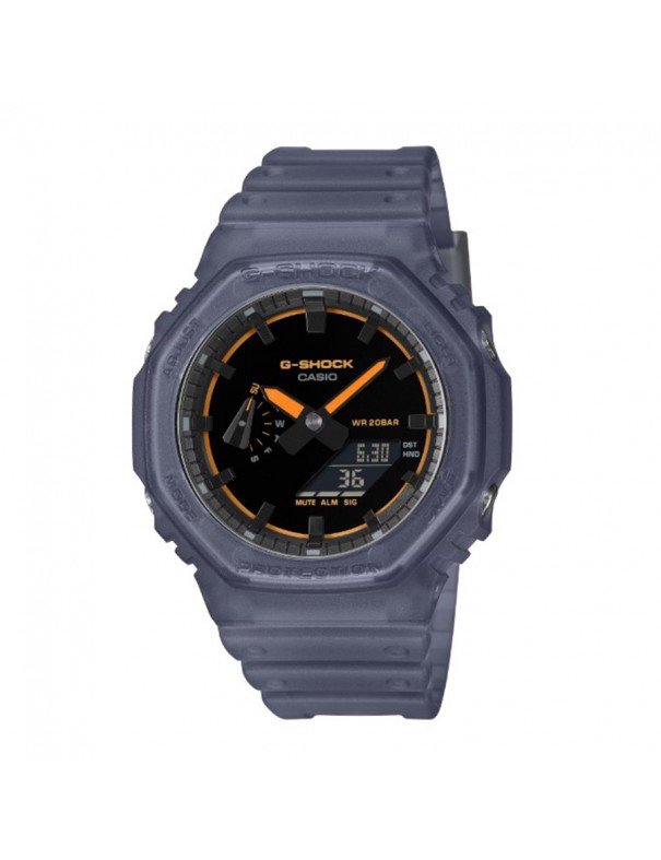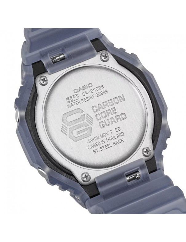 Reloj Casio G-Shock Classic GA2100K-2AER. Reloj digital-analógico de estilo moderno y resistente, conocido por su icónica forma octogonal y su diseño deportivo. Presenta una carcasa y correa de resina azul intenso que combinan ligereza y durabilidad, con detalles en la esfera que facilitan la lectura de la hora y las funciones adicionales. Equipado con características prácticas como hora mundial, cronómetro, temporizador, alarmas diarias, calendario automático y doble iluminación LED para visibilidad en la oscuridad, este modelo está diseñado para resistir las exigencias del uso diario más activo. La estructura Carbon Core Guard refuerza la protección del módulo frente a impactos y vibraciones. Su resistencia al agua es de 20 bar (equivalente a 20 ATM o 200 m). Garantía de 3 años.