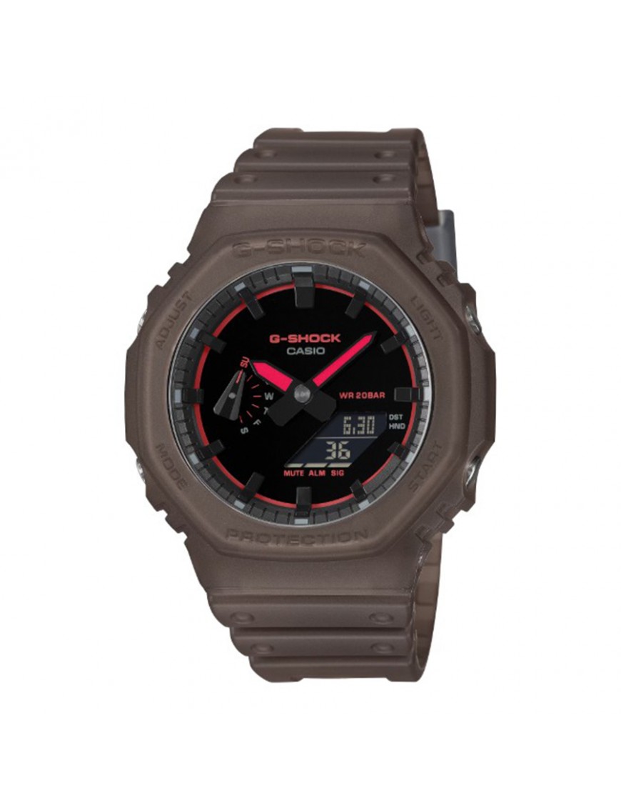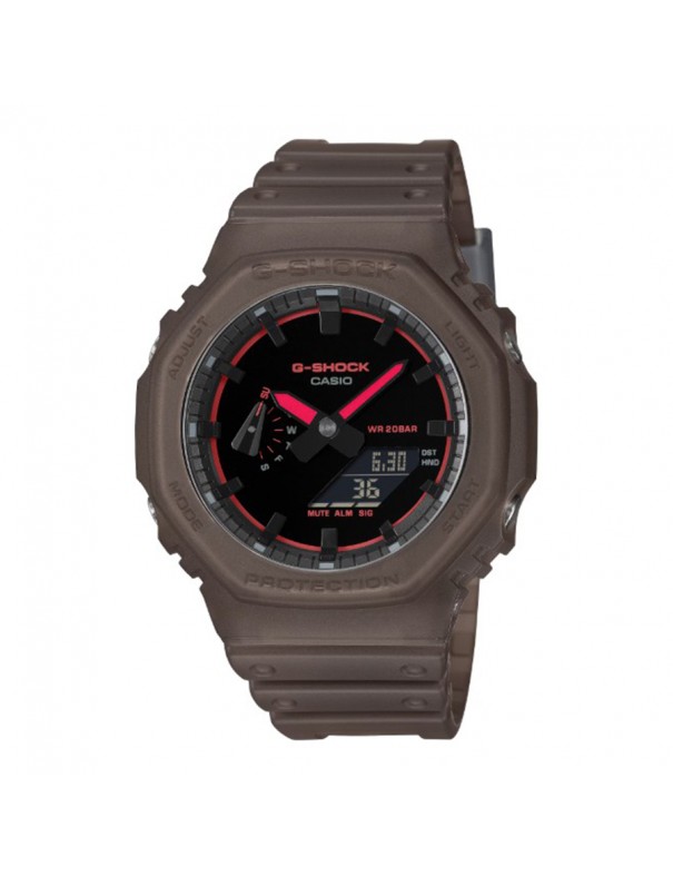 Reloj Casio G-Shock Classic GA-2100K-5AER. Reloj digital-analógico de estilo moderno y resistente, conocido por su icónica forma octogonal y su diseño deportivo. Presenta una carcasa y correa de resina marrón que combinan ligereza y durabilidad, con detalles rojos en la esfera que facilitan la lectura de la hora y las funciones adicionales. Equipado con características prácticas como hora mundial, cronómetro, temporizador, alarmas diarias, calendario automático y doble iluminación LED para visibilidad en la oscuridad, este modelo está diseñado para resistir las exigencias del uso diario más activo. La estructura Carbon Core Guard refuerza la protección del módulo frente a impactos y vibraciones. Su resistencia al agua es de 20 bar (equivalente a 20 ATM o 200 m). Garantía de 3 años.