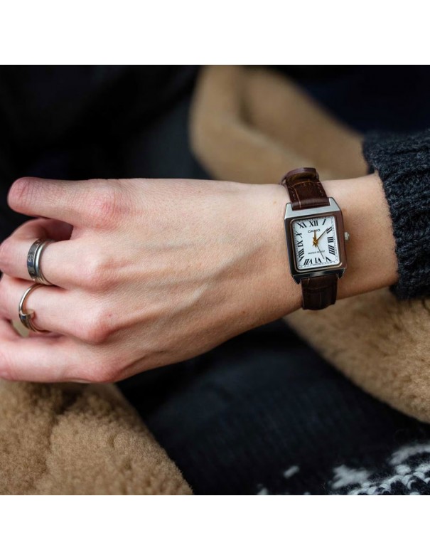 Reloj Casio para mujer LTP-B150L-7B2EF. La caja es de acero y mide 22 mm de diámetro. La pulsera es de piel con hebilla. No es sumergible (3ATM) y tiene tres años de garantía.