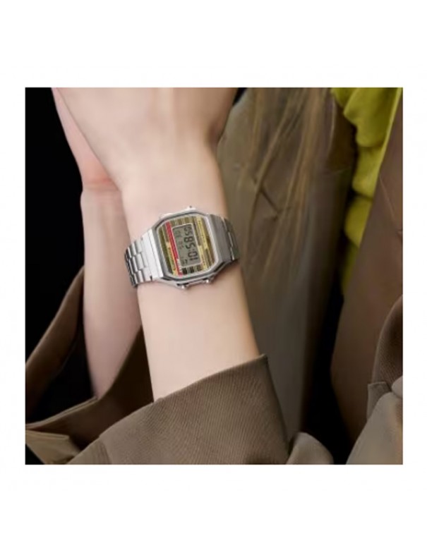 Reloj Casio Vintage A168WEHA-9AEF. Caja de resina de 38.6×36.3×9.6 mm. Cristal acrílico. Correa de acero ajustable. Función de hora, cronómetro, alarma, calendario automático y luz. Resistencia 3ATM por lo que sólo soporta pequeñas salpicaduras.