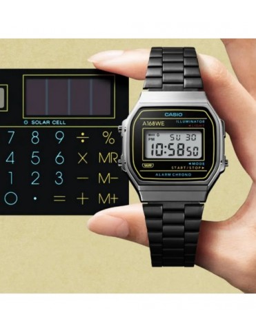 Reloj Casio Vintage A168WEHB-1AEF. Caja de resina de 38.6×36.3×9.6 mm. Cristal acrílico. Correa de acero IP negro ajustable. Función de hora, cronómetro, alarma, calendario automático y luz. Resistencia 3ATM por lo que sólo soporta pequeñas salpicaduras. Garantía de tres años contra defectos de fabricación