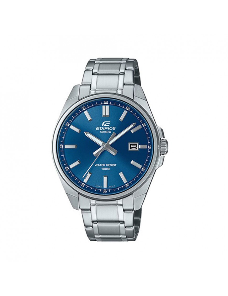 Reloj Casio Edifice para hombre EFV-150D-2AVUEF. La caja es de acero y mide 42.6 mm de diámetro. La pulsera es del mismo material y lleva triple cierre desplegable. La esfera es de color azul, tiene calendario y el cristal es mineral. Es sumergible a 10 ATM (buceo sin botella) y tiene tres años de garantía.