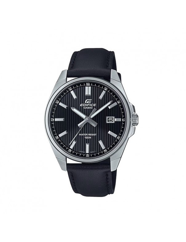 Reloj Casio Edifice para hombre EFV-150L-1AVUEF. La caja es de acero y mide 42.6 mm de diámetro. La pulsera es de piel de color negro. La esfera es de color negro, tiene calendario y el cristal es mineral. Es sumergible a 10 ATM (buceo sin botella) y tiene tres años de garantía.