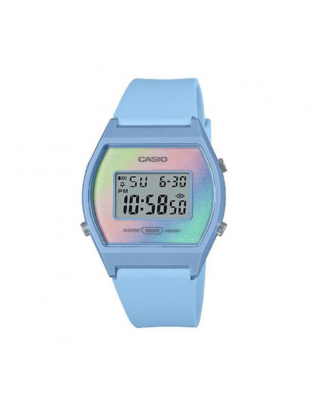 Reloj Casio LW-205H-2AEF para mujer digital. Caja de resina de 35mm y correa azul del mismo material con hebilla. Cuenta con luz Led, alarma, cronómetro, calendario y formato 12/24 horas. Resistente al agua 5 ATM (permite el nado en superficie). Tiene tres años de garantía.