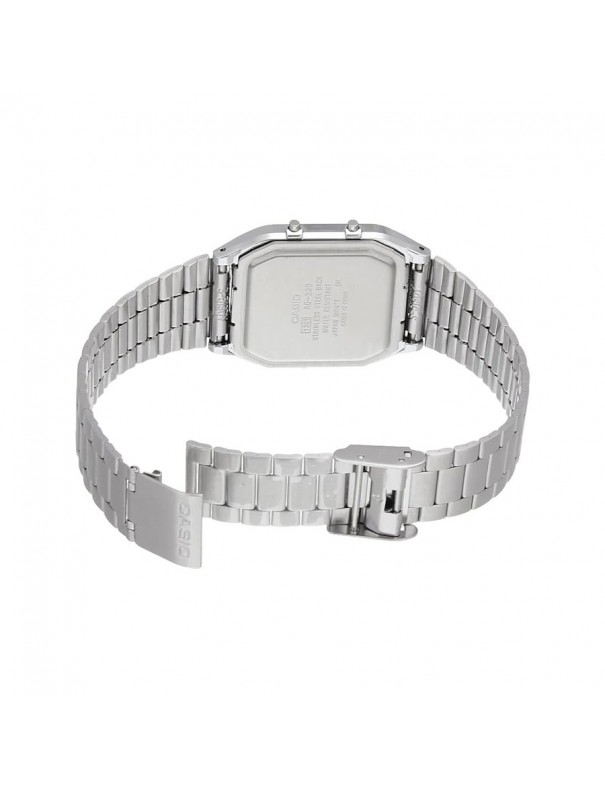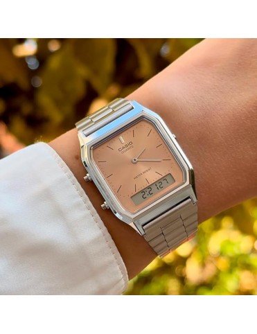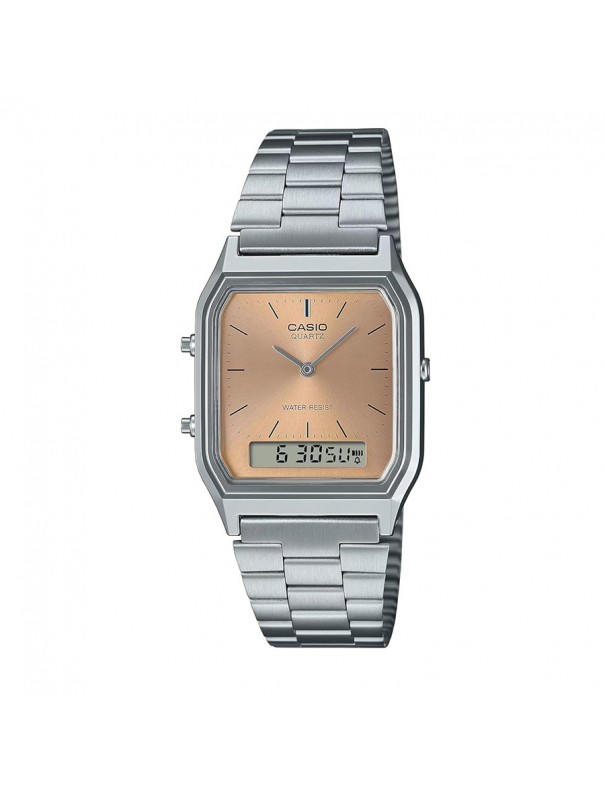 Reloj Casio Vintage AQ-230A-4AMQYES. Caja de resina de 27.8mm de diámetro con esfera en color champán bajo un cristal mineral. Combina dos tipos de pantalla, analógico y digital. La correa es de acero formada por eslabones y con cierre milanés. Funciones: calendario, cronógrafo y alarma.