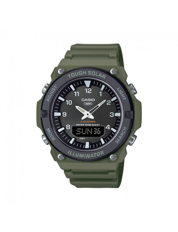 Reloj Casio Timeless Collection AQ-S820W-3BVEF. Caja de resina de color verde oscuro con correa de resina a juego y cierre de hebilla. Funciones: energía solar estable (Tough Solar), hora mundial, hora dual, cronómetro, temporizador, 5 alarmas, luz LED, calendario automático. Fácil de ver en la oscuridad e ideal para viajes al extranjero. Resistente al agua hasta 10 bar. Garantía de 3 años.
