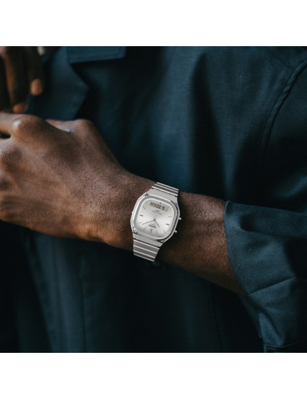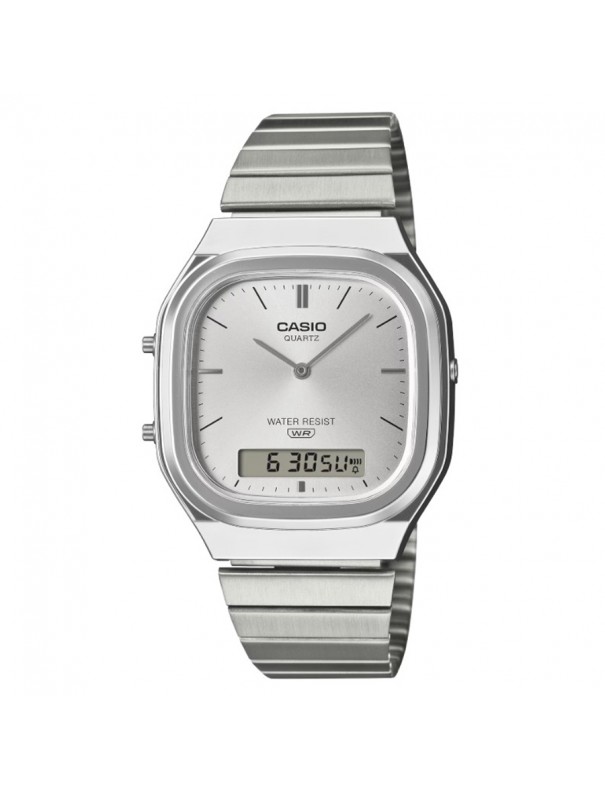Reloj Casio Edgy Collection AQ-240E-7AEF. Caja de resina plateada con esfera plateada con acabado sun-ray, y correa de acero inoxidable en tono plateado con cierre milanés. Incluye funciones de doble horario, cronómetro de 1/100 s, alarma diaria y calendario automático. Cristal acrílico protegido y movimiento de cuarzo de bajo consumo. Resistente al agua hasta 3 bar. Garantía de 3 años.