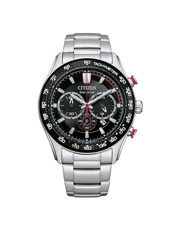 Reloj Citizen Eco Drive Crono Hombre CA4484-88E, cronógrafo. Esfera negra de 43mm de diámetro, ventana de calendario y bisel de color negro con taquímetro. Agujas e indicadores luminiscentes. Pulsera de acero y cristal mineral. Sumergible a 10ATM, por lo que es apto para ducha y baño con inmersión (inmersión con botella). No necesita pila. Sistema Eco Drive con reserva de carga de 9 meses. Recoge la luz natural y artificial, convirtiéndola en energía y acumulando la sobrante.