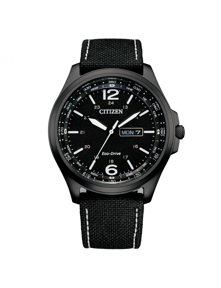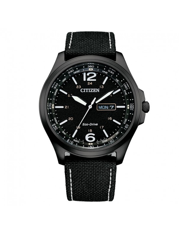 Reloj Citizen Eco-Drive para hombre AW0115-11E. La esfera es de acero y mide 44 mm de diámetro. La pulsera es de nylon con hebilla. Incluye sistema Eco-Drive de alimentación solar y calendario con día de la semana. Es sumergible a 10 ATM y permite el buceo sin botella. Garantía de tres años.