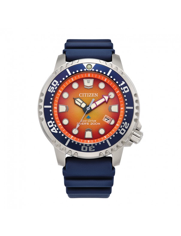 Reloj Citizen Promaster Eco-Drive para hombre BN0169-03X. La caja es de acero y mide 44 mm de diámetro. La pulsera es de caucho azul. Lleva calendario y agujas e índices luminiscentes. Es sumergible a 20 ATM y lleva bisel giratorio unidireccional. Garantía de tres años.