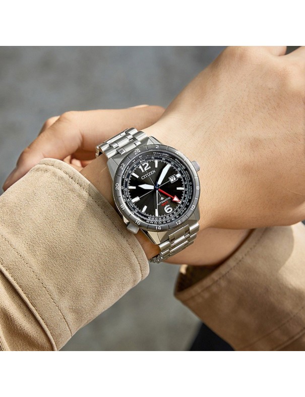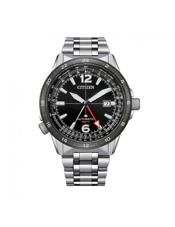 Reloj Citizen Automatic Promaster NB6046-59E. Caja de acero de 44.5 mm de diámetro con esfera negra y cristal de zafiro. La correa es de acero. Su funcionamiento es automático de recarga automática. Función GMT. 50 horas reserva de marcha si está al 100%. Garantía de 3 años.