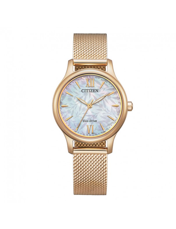 Reloj Citizen Eco-Drive para mujer EM0892-80D. La pulsera es de acero, así como la esfera, que mide 30 mm de diámetro. Incluye sistema Eco-Drive de alimentación solar. Es sumergible a 5 ATM por lo que permite el nado en superficie sin inmersión. Garantía de tres años.