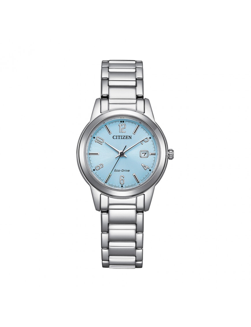 Reloj Citizen Eco Drive para mujer FE1241-71L. La caja es de acero y mide 29,4 mm de diámetro. La esfera es de color azul. La pulsera es del mismo material. Incluye sistema Eco Drive de alimentación solar y calendario. Es sumergible a 10 ATM y tiene tres años de garantía.