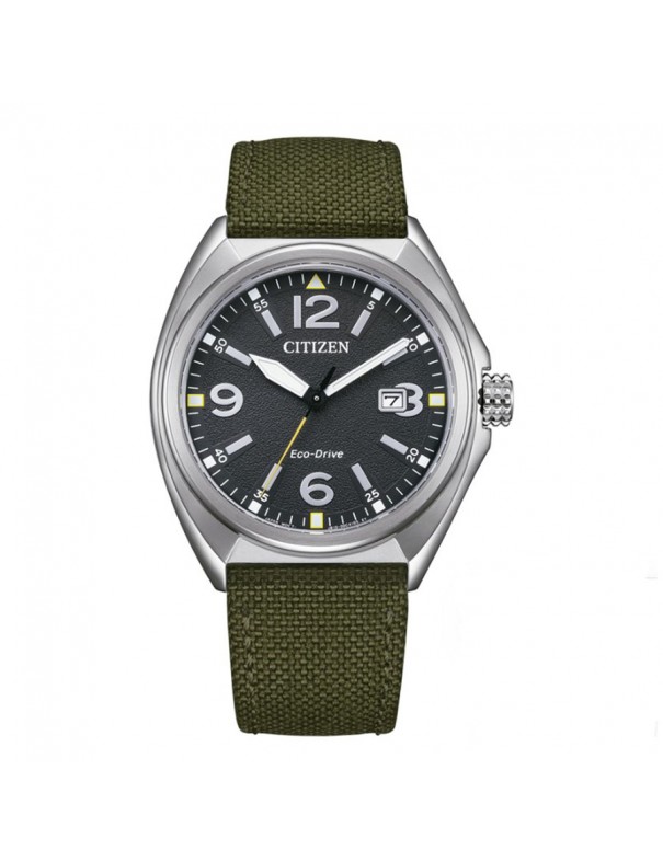 Reloj Citizen Military AW1571-09E. Combina diseño militar con tecnología Eco Drive, funcionando con luz y con una reserva de carga de hasta 8 meses. Su caja de acero de 40,8 mm y correa de nylon khaki ofrecen un estilo robusto y cómodo. La esfera negra con agujas luminiscentes asegura buena visibilidad en cualquier condición. Un reloj resistente y funcional para el día a día. Resistente al agua hasta 100 m y con garantía internacional de 3 años.