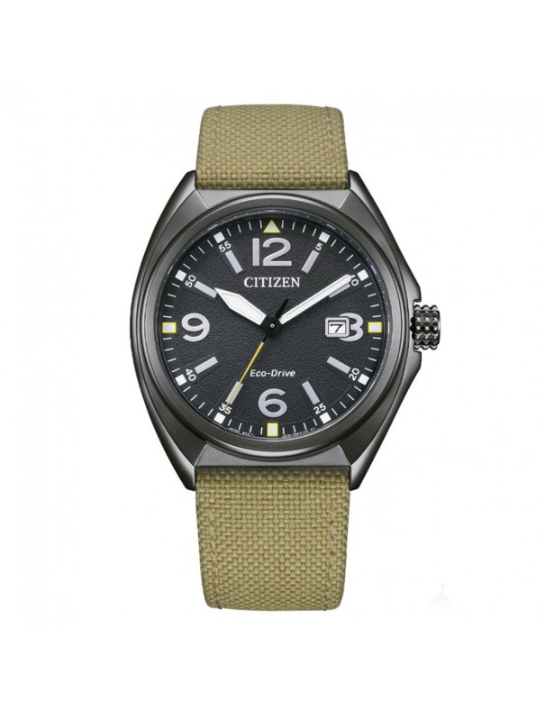 Reloj Citizen Military AW1575-08E. Ofrece un estilo militar moderno con tecnología Eco Drive, que funciona con luz y proporciona hasta 8 meses de autonomía. Su caja de acero con acabado negro y correa de nylon beige crean un contraste atractivo y resistente. La esfera negra incluye agujas y marcadores luminiscentes para máxima legibilidad. Ideal para uso diario con diseño robusto. Resistente al agua hasta 100 m y con garantía internacional de 3 años.