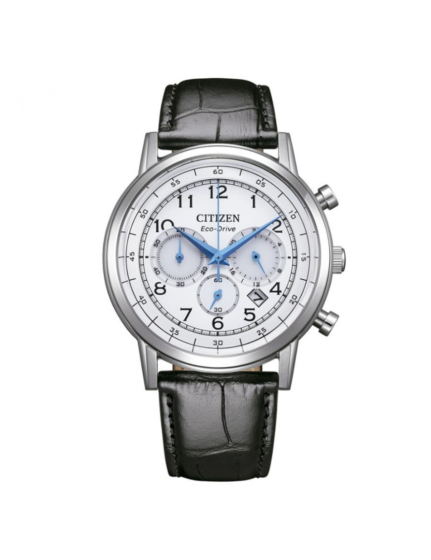 Reloj Citizen Chrono CA4630-02A. Combina elegancia clásica con funcionalidad deportiva gracias a su movimiento Eco Drive, que se alimenta de luz y ofrece hasta 9 meses de autonomía. Su caja de acero de 42 mm se complementa con una correa de piel y cristal mineral esférico. Cuenta con cronógrafo a 1/5 segundo y calendario integrado. Ideal para quienes buscan precisión sin sacrificar estilo. Resistente al agua hasta 50 m y con garantía de 3 años.
