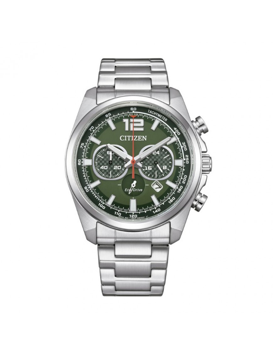 Reloj Citizen Active Sport Chrono CA4640-50X. Ofrece un estilo deportivo y robusto con tecnología Eco Drive, alimentado por luz y con una reserva de hasta 9 meses. Su caja de acero de 41 mm se combina con un brazalete metálico de cierre doble pulsador y una llamativa esfera verde. Incluye cronógrafo, calendario, taquímetro y detalles luminiscentes para mayor funcionalidad. Resistente al agua hasta 100 m y con garantía de 3 años.