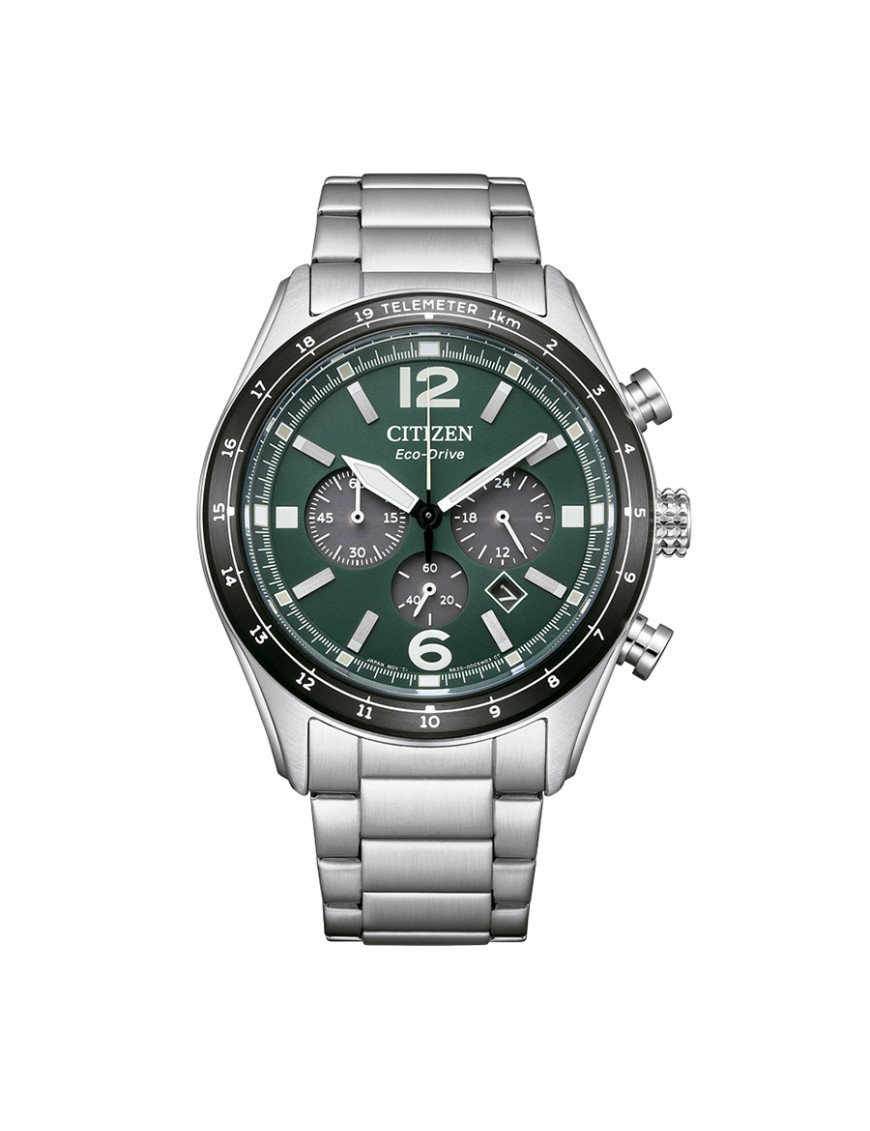 Reloj Citizen Chrono Aviation CA4654-55X. Está fabricado en acero inoxidable con esfera verde y bisel negro fijo con taquímetro. Incorpora movimiento Eco Drive con reserva de carga de 9 meses y funciones de cronógrafo y calendario. Cuenta con agujas e índices luminosos, cristal mineral y cierre de doble pulsador.