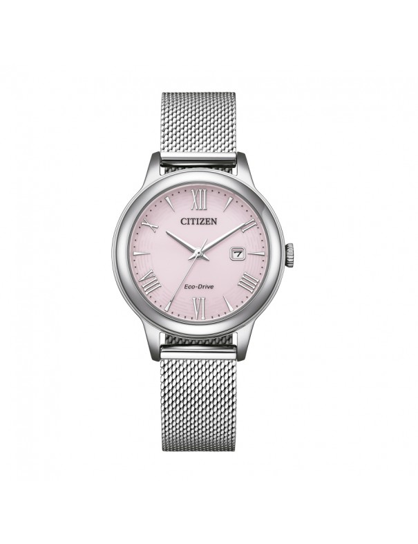 Reloj Citizen Lady Dress EW2621-75X. Fabricado en acero inoxidable con esfera rosa y cristal mineral. Funciona con tecnología Eco Drive con una reserva de carga de 6 meses e incluye función de calendario. Tiene un diámetro de 31,5 mm, un grosor de 9,6 mm y brazalete de malla milanesa en acero inoxidable. Es resistente al agua hasta 10 bar (100 metros) y cuenta con una garantía de 3 años.