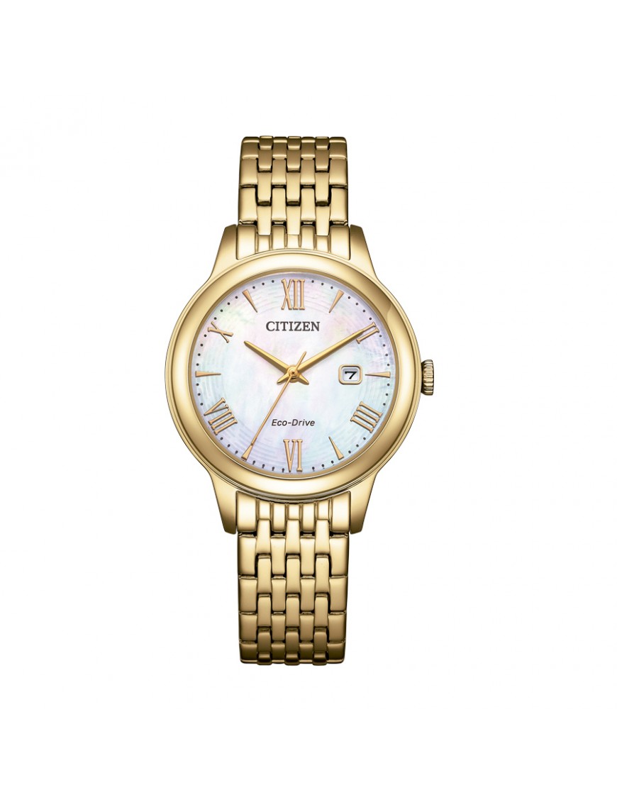 Reloj Citizen Lady Dress EW2623-53D. Fabricado en acero inoxidable con acabado en chapado oro rosa, esfera blanca y cristal mineral. Funciona con tecnología Eco Drive con una reserva de carga de 6 meses e incluye función de calendario. Mide 31,5 mm de diámetro y 9 mm de grosor, con brazalete de acero y cierre de doble pulsador. Es resistente al agua hasta 10 bar (100 metros) y cuenta con una garantía de 3 años.
