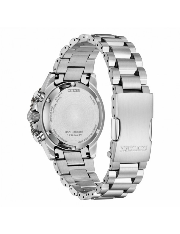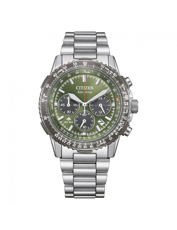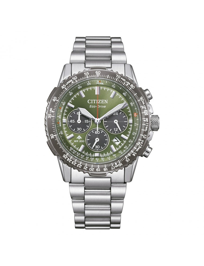 Reloj Citizen Eco Drive Chrono CA4664-60W. Fabricado en acero inoxidable con esfera metálica verde y cristal de zafiro antirreflejos. Incorpora movimiento Eco Drive con reserva de carga de 9 meses, cronógrafo de 60 minutos y calendario. Mide 40 mm de diámetro y 13,8 mm de grosor, con brazalete de acero y bisel giratorio con regla de cálculo.