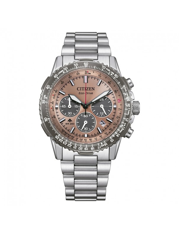Reloj Citizen Eco Drive Chrono CA4664-60X. Fabricado en acero inoxidable con esfera metálica marrón y cristal de zafiro antirreflejos. Incorpora movimiento Eco Drive con reserva de carga de 9 meses, cronógrafo de 60 minutos y calendario. Mide 40 mm de diámetro y 13,8 mm de grosor, con brazalete de acero y bisel giratorio con regla de cálculo.