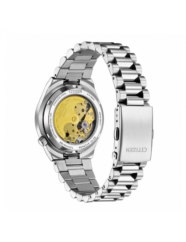 Reloj Citizen Tsuyosa NJ0200-50Z. Fabricado en acero inoxidable con cristal de zafiro y esfera verde. Tiene una caja de 37 mm de diámetro y 11,5 mm de grosor, con un peso de 120 g. Incorpora funciones de calendario con lupa y movimiento automático con 40 horas de reserva de marcha. Sus agujas e índices luminiscentes permiten una lectura clara.