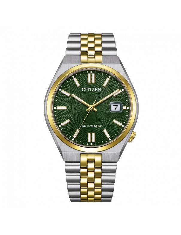 Reloj CITIZEN Tsuyosa 60 de la colección Mecánico NK0024-54X. Caja de acero inoxidable bicolor (plateado y dorado), esfera verde; pulsera de acero inoxidable a juego con cierre desplegable de doble pulsador. Movimiento automático calibre 8310 con función de reserva de marcha de 60 horas y calendario. Sumergible hasta 5 bares.