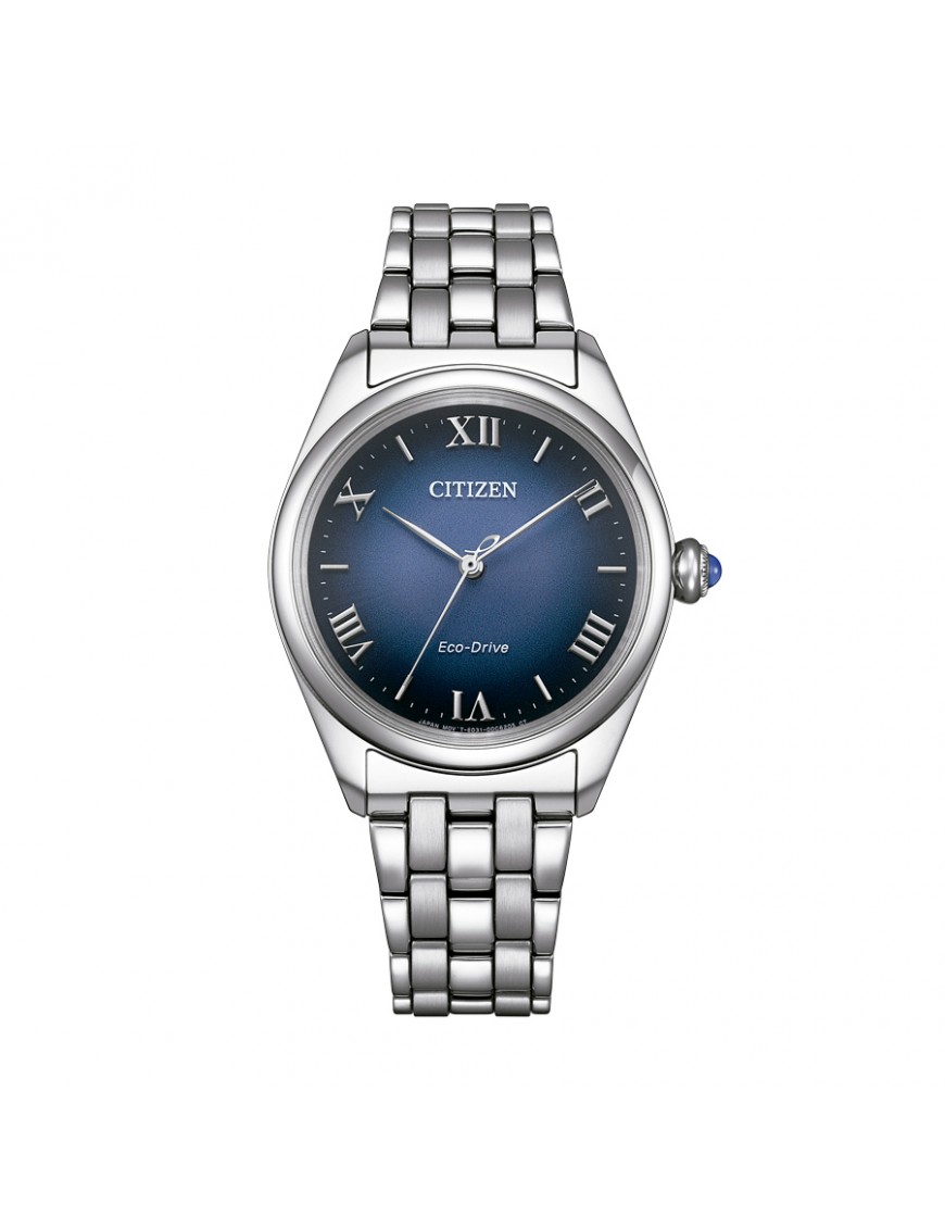 Reloj CITIZEN Lady EM1140-80L. Caja de acero inoxidable plateada de 33 mm, esfera azul degradada y brazalete de acero inoxidable con cierre desplegable oculto. Funciones de horas, minutos y segundos gracias al movimiento Eco-Drive con reserva de marcha de unos 6 meses. Sumergible hasta 5 bar.