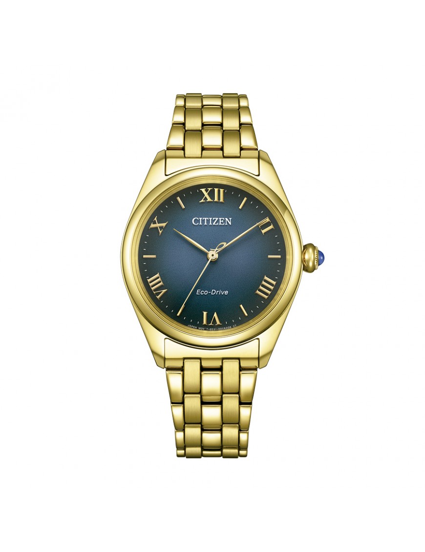 Reloj CITIZEN Lady EM1142-84L. Caja de acero inoxidable con acabado en oro amarillo, esfera azul degradada y brazalete de acero inoxidable con cierre desplegable oculto. Funciones de horas, minutos y segundos gracias al movimiento Eco-Drive con reserva de marcha de unos 6 meses. Sumergible hasta 5 bar.