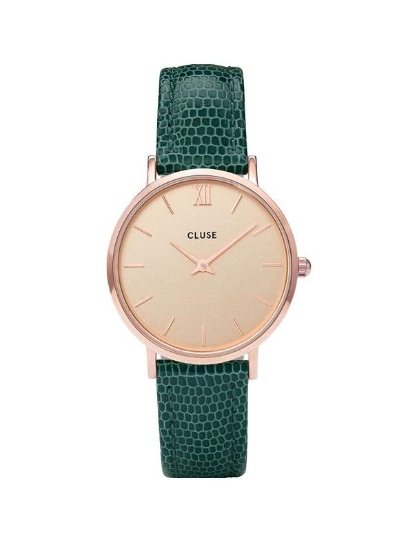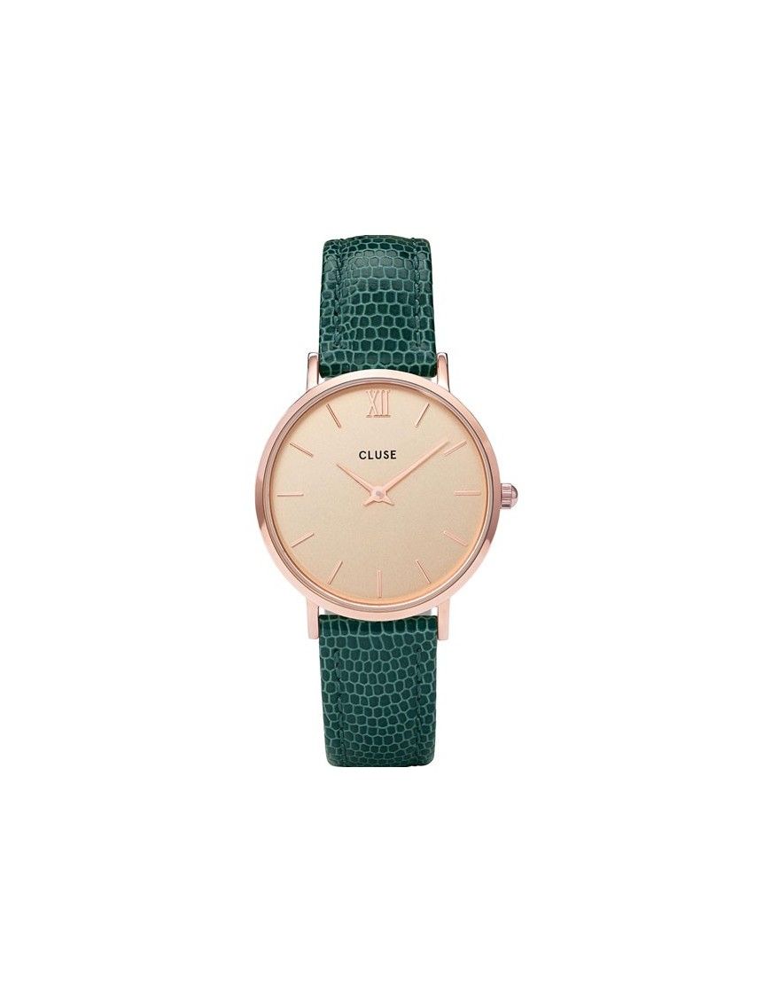 Reloj Cluse Minuit Mujer CL30052. Es un reloj original de la marca Cluse. Pertenece a la colección Minuit Rose de estilo minimalista. Este reloj es analógico de dos agujas con movimiento de cuarzo, alimentado con pila. Este reloj Cluse tiene la correa en piel auténtica en imitación serpiente de color verde y con cierre en hebilla. El dial en color champagne de 38 milímetros y 7 milímetros de grosor, con agujas de color oro rosa al igual que la caja. La resistencia al agua es de 30 metros (3 ATM) para pequeñas salpicaduras. Un cristal mineral cubre a la esfera. La garantía del fabricante de los relojes Cluse es de 2 años contra defectos de fabricación.