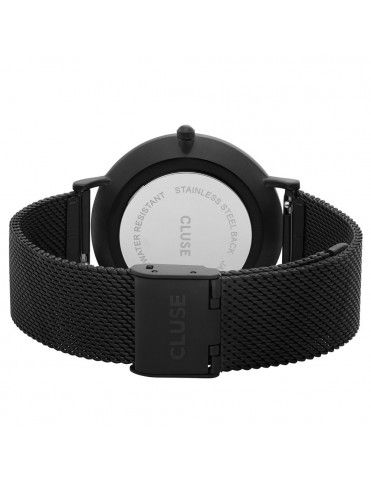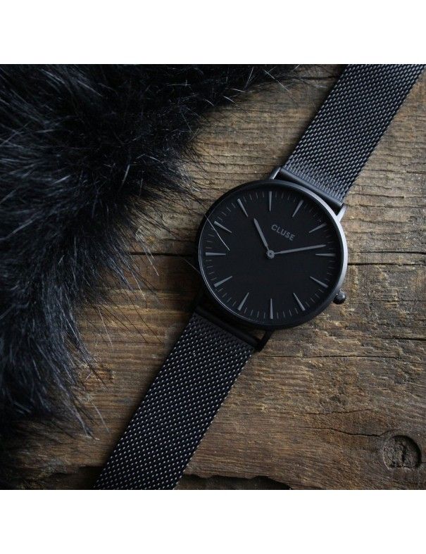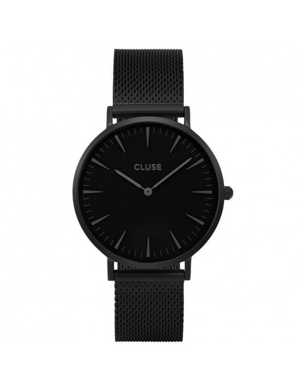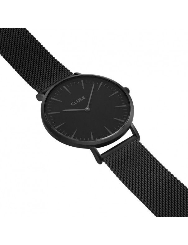 Reloj Cluse La Bohème Mujer CW0101201005. Es un reloj diseñado por la marca Cluse, pertenece a la Colección Bohème, para mujer. Es un modelo analógico de dos agujas con movimiento de cuarzo alimentado con pila. La caja que encierra al mecanismo mide de diámetro 38 milímetros y es sumergible a 30 metros. Está realizada en acero hipoalergénico, terminada en color negro. Brazelete de acero negro tipo malla milanesa con cierre autoajustable. Un cristal mineral cuida a la esfera, la cual es de color negra. Los marcadores horarios son índices en color negro como las agujas. Somos distribuidores oficiales de los relojes Cluse que cuentan con una garantía del fabricante de 2 años contra defectos de fabricación. Todos nuestros pedidos son enviados con envoltorio especial de regalo y con sus cajas originales.