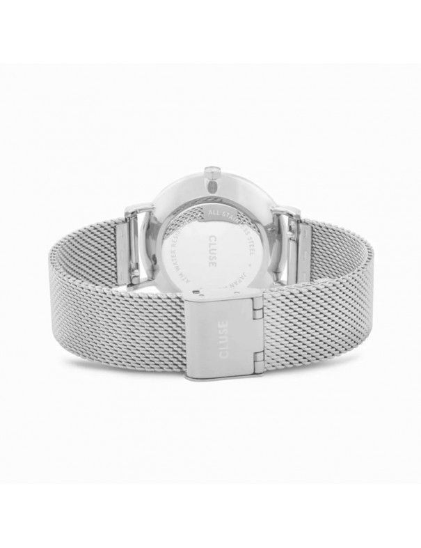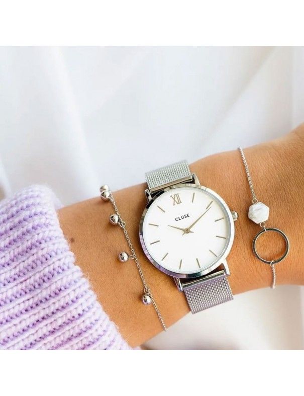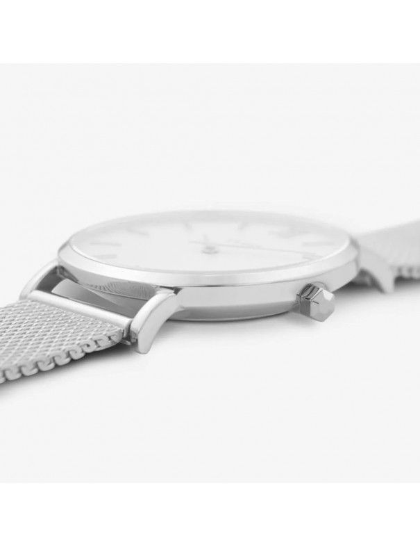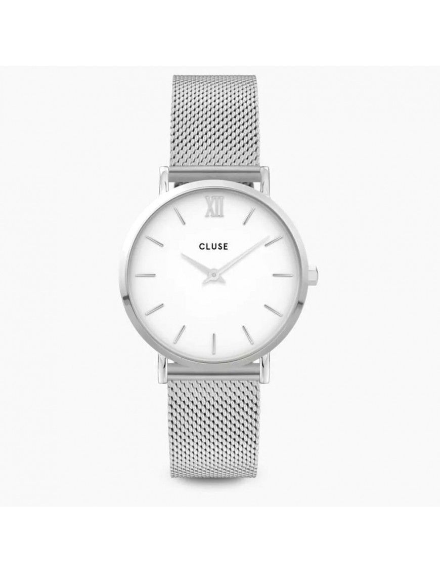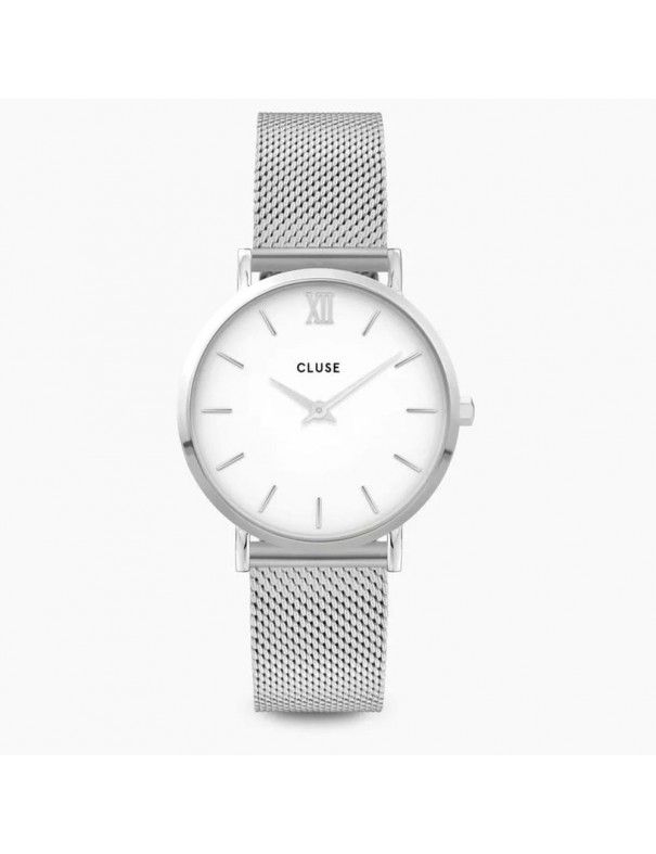 Reloj Cluse Minuit Mesh Silver Mujer CW0101203002. Está realizada en acero hipoalergénico, terminada en color plateado. Brazelete de acero plateado tipo malla milanesa con cierre autoajustable. Un cristal mineral cuida a la esfera, la cual es de color blanca. Los marcadores horarios son índices en color plata como las agujas.