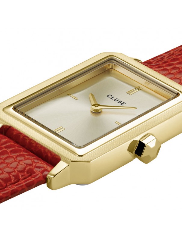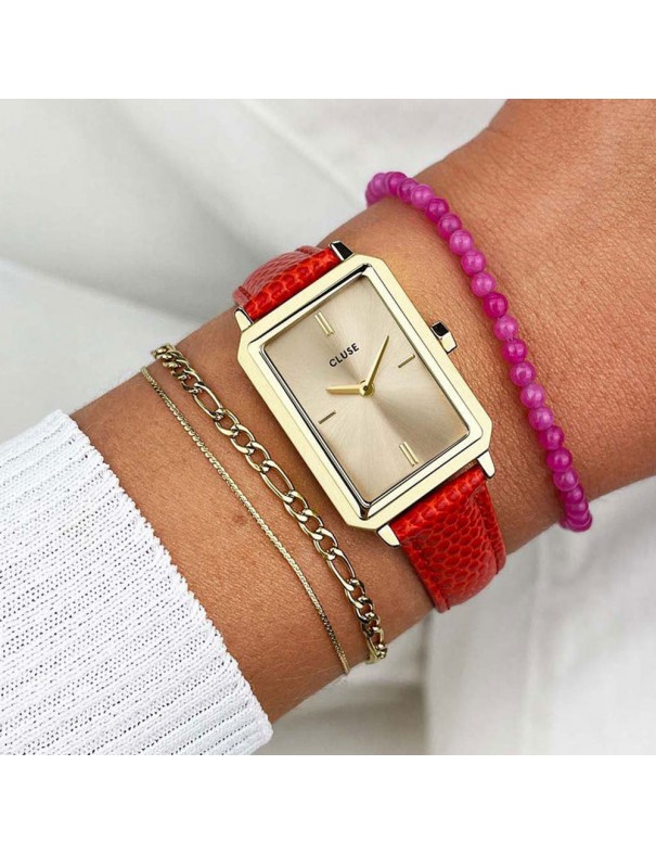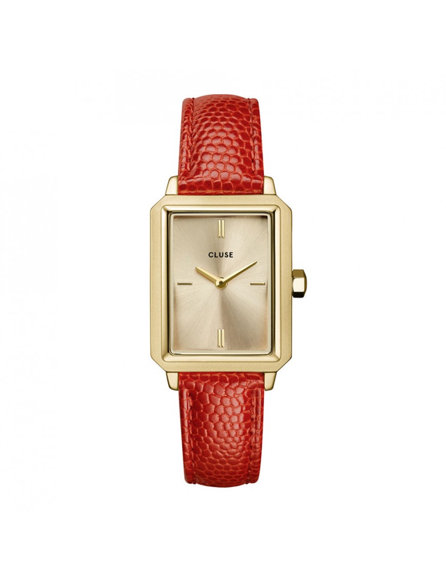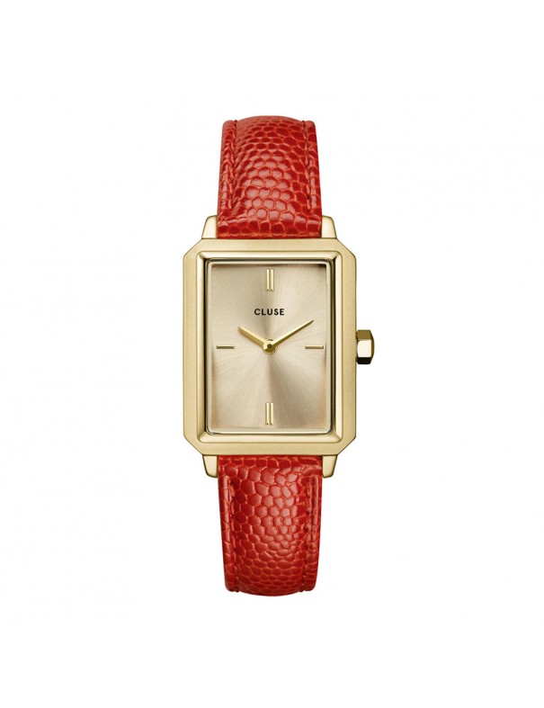 Reloj Cluse Fluette Coral CW11705, analógico de dos agujas. Caja de acero en color dorado. 30mm de diámetro aproximadamente. Pulsera de piel en color coral. Sumergible a 5ATM, por lo que es apto para ducha y baño sin inmersión.