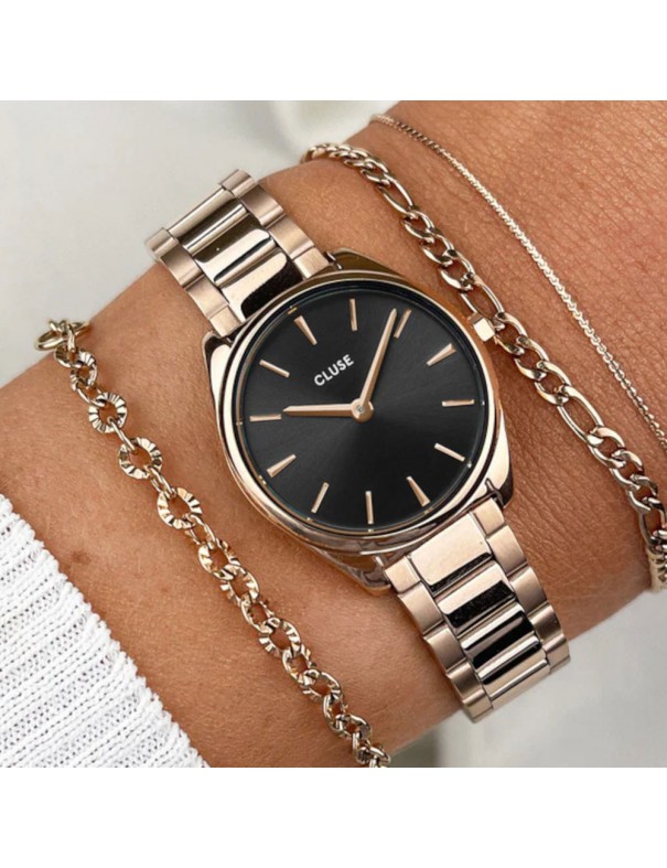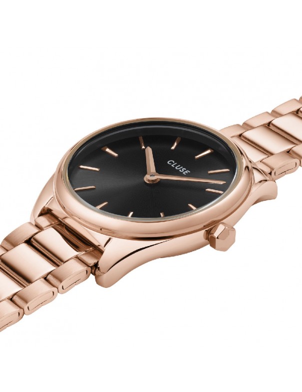 Reloj Cluse Feroce Mini CW11703, analógico de dos agujas. Caja y pulsera de acero color rosado. Caja de 25mm de diámetro. Cristal mineral. Sumergible a 5ATM, por lo que es apto para ducha y baño sin inmersión.