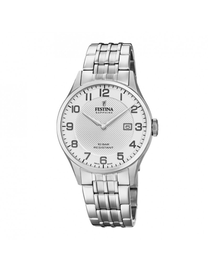 Reloj Festina Hombre Swiss Made F20005/1, analógico sin segundero. Esfera de 40mm de diámetro con ventana de calendario. Pulsera de acero y cristal de zafiro. Movimiento Simple Suizo. Sumergible a 10ATM, por lo que es apto para ducha y baño con inmersión.