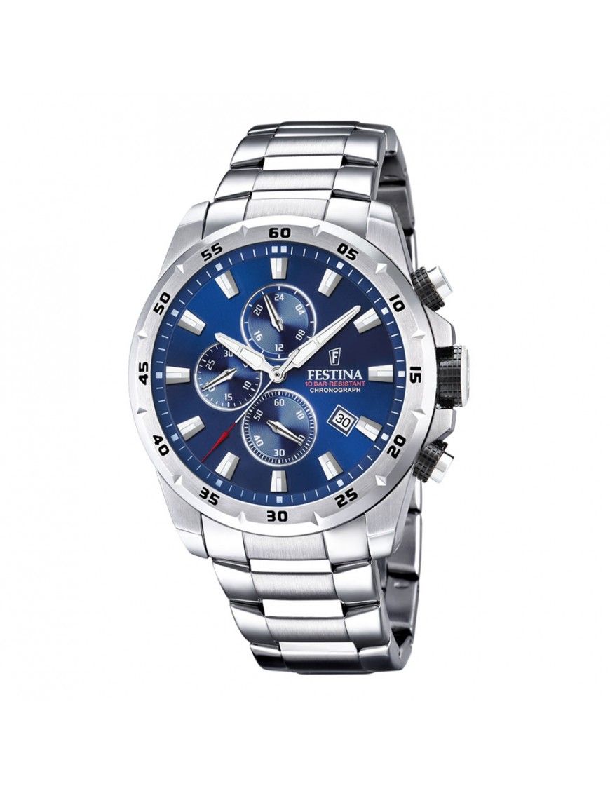 Reloj Festina Hombre Crono F20463/2, cronógrafo analógico. Esfera azul de 45mm de diámetro con tres mini esferas y ventana de calendario. Agujas e indicadores luminiscentes. Pulsera de acero y cristal mineral. Sumergible a 10ATM, por lo que es apto para ducha y baño con inmersión (inmersión con botella).