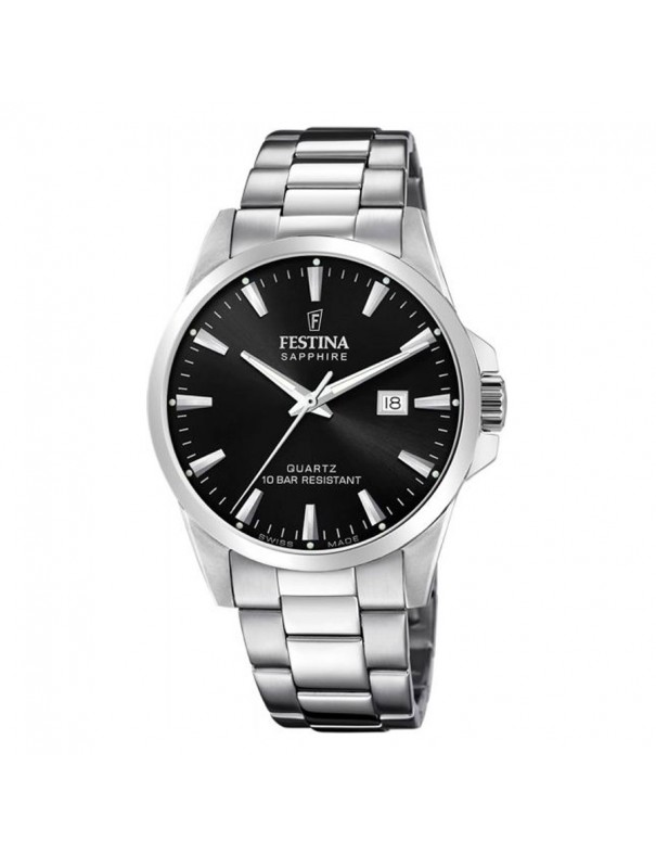 Reloj Festina para hombre Swiss F20024/4. La esfera es de acero y mide 41 de diámetro. La pulsera es del mismo material y lleva cierre desplegable de seguridad. Incluye calendario, cristal zafiro que no se raya y maquinaria suiza. Es sumergible a 10 ATM por lo que permite el buceo sin botella. Garantía de tres años.