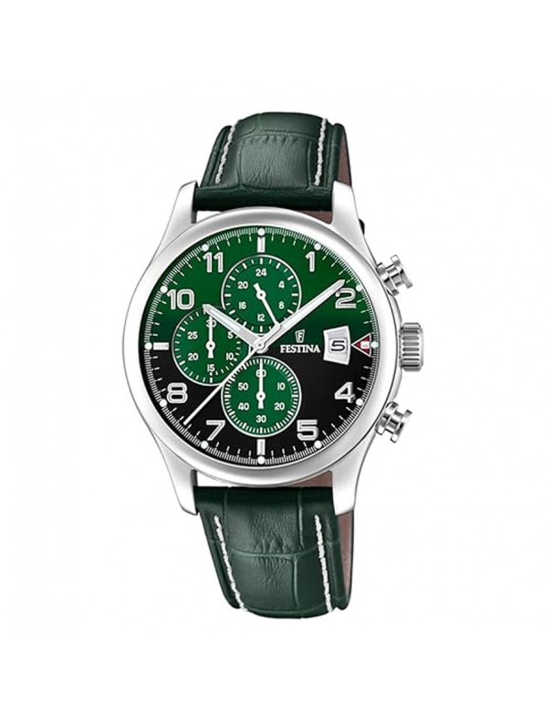 Reloj Festina para hombre F20375/8. La esfera es de acero y mide 43 mm de diámetro. La pulsera es de piel con hebilla. Incluye calendario, cronógrafo y cristal mineral. Es sumergible a 10 ATM y permite el buceo sin botella (no recomendable para la pulsera de piel). Garantía de tres años.