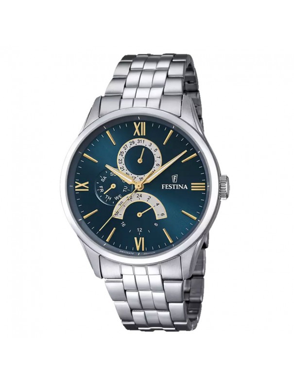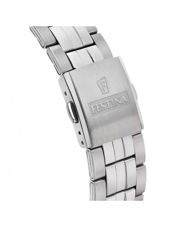 Reloj de Hombre Festina Retro F16822/A, analógico con segundero. La caja es de acero y mide 43 mm de diámetro. La pulsera es del mismo material y lleva cierre con doble pulsador. Modelo multifunción con día del mes, día de la semana y modo 24 horas. Es sumergible a 5 ATM (nado en superficie) y cuenta con tres años de garantía.