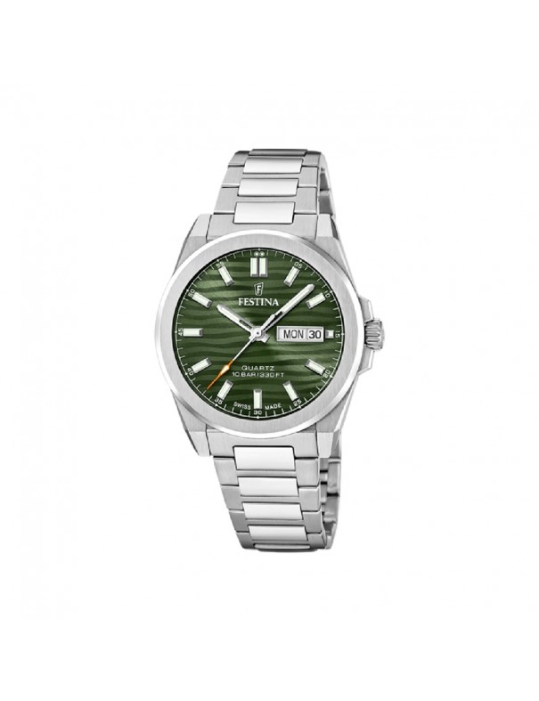 Reloj Festina Swiss Classics Verde Hombre F20073/4. Caja de acero de 40mm de diámetro con cristal de zafiro y esfera verde. La correa es de acero inoxidable y tiene cierre desplegable. Incluye calendario.