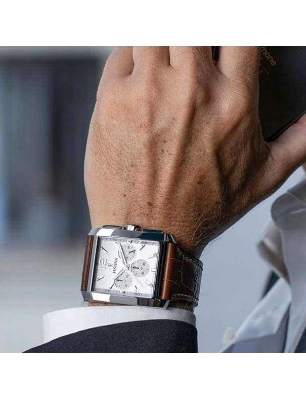 Reloj Festina Timeless Chronograph con Esfera Plateada F20636/1. Caja rectangular de 37mm de diámetro con esfera en color plateado y 6 agujas bajo un cristal mineral. La correa es de piel y cuenta con cierre de hebilla. Tiene función de cronógrafo. Estanqueidad de 5 ATM. Garantía de 3 años.