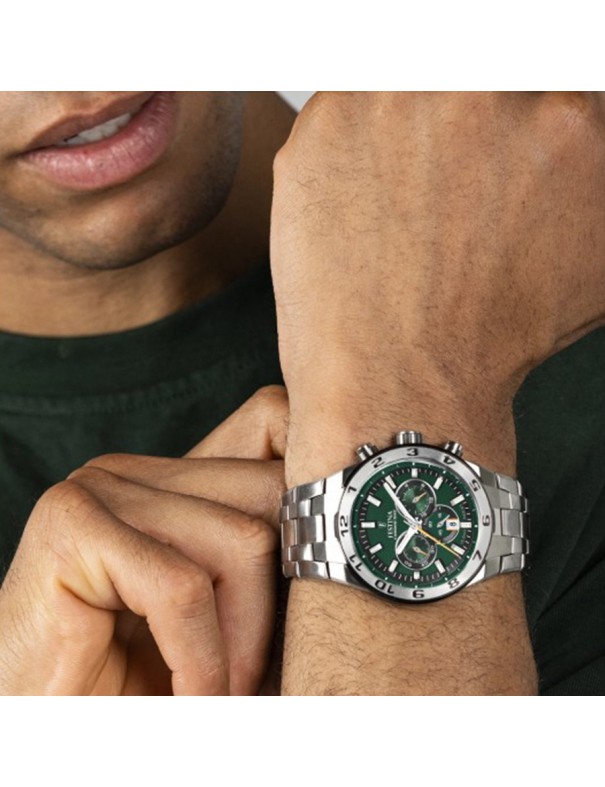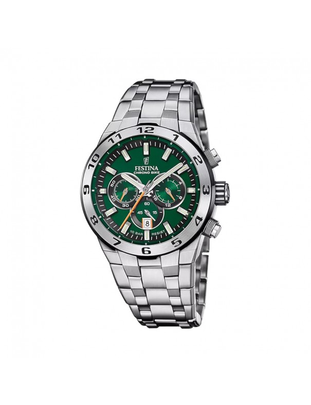 Reloj Festina Chrono Bike Verde F20670/2. Caja de acero de 44,5 mm de diámetro con esfera en color verde y 6 agujas bajo un cristal mineral. La correa es de acero con cierre desplegable. Incluye calendario. Tiene función de cronógrafo. Estanqueidad de 10 ATM. Garantía de 3 años.