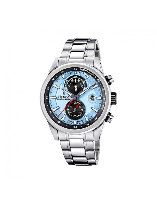 Reloj Festina Cronógrafo Hombre F20694/2. Caja de acero de 44 mmm de diámetro con esfera en color azul y bisel en color negro bajo un cristal mineral. La correa es de acero con cierre de doble pulsador. Incluye calendario. Tiene función de cronógrafo. Estanqueidad de 10 ATM. Garantía de 3 años.