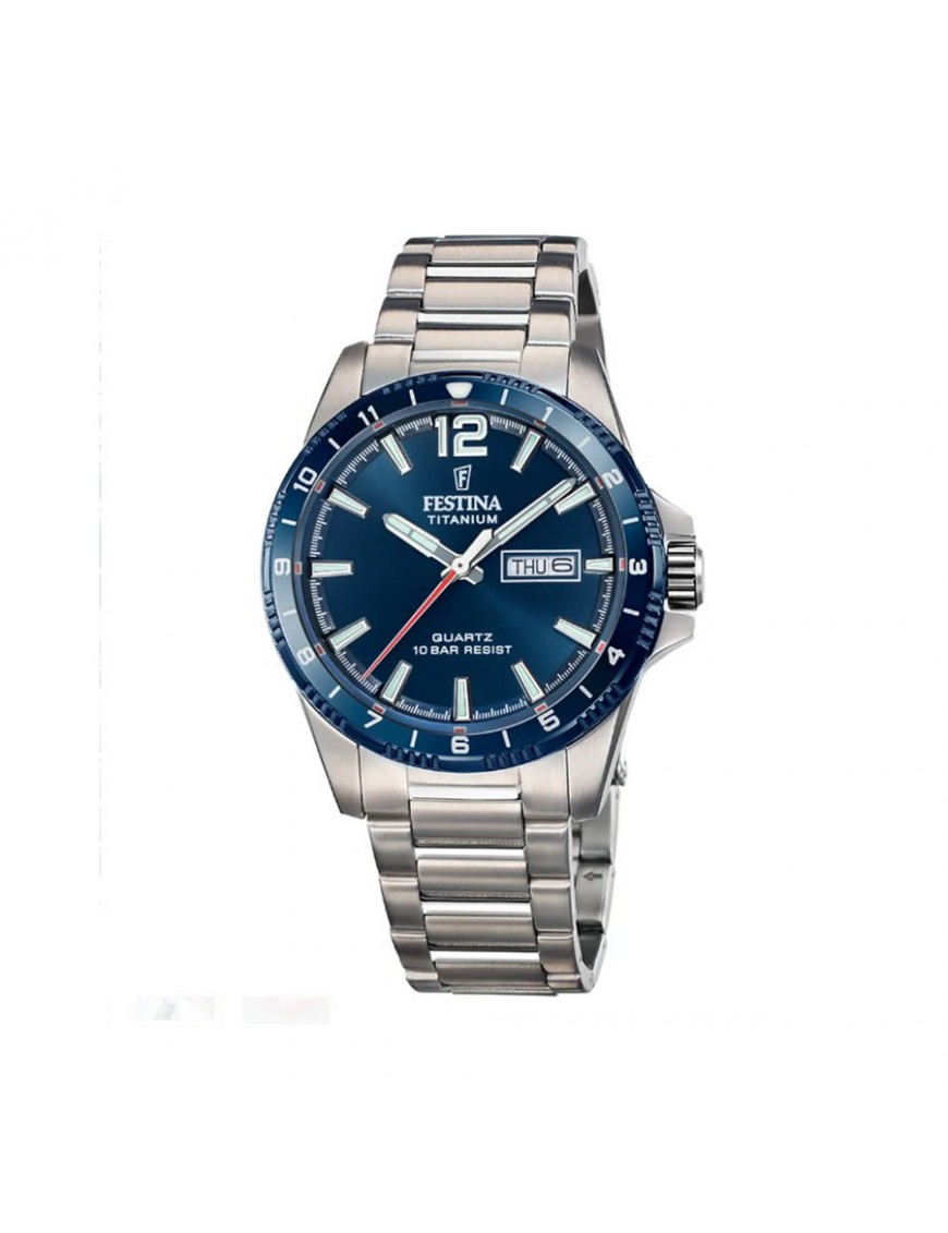 Reloj Festina Titanium F20698/2. Caja de acero de 43mm de diámetro con esfera y bisel en color azul bajo un cristal mineral. La correa es de titanio y tiene cierre desplegable. Incluye calendario. Estanqueidad de 10 ATM. Garantía de 3 años.