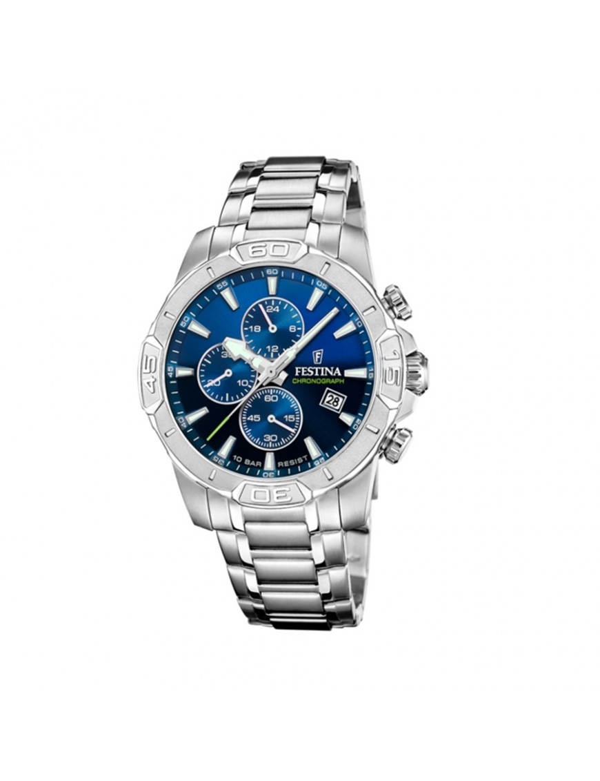 Reloj Festina Timeless Chronograph Azul F20704/4. Caja de acero de 45mm de diámetro con esfera en color azul bajo un cristal mineral. La correa es de acero y tiene cierre de doble pulsador. Incluye calendario y tiene función de cronógrafo. Estanqueidad de 10 ATM. Garantía de 3 años.