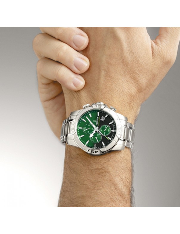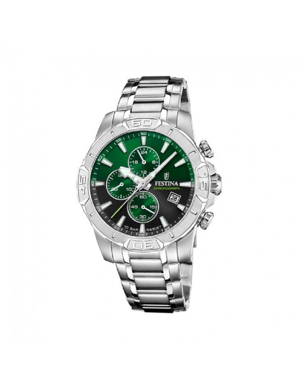 Reloj Festina Timeless Chronograph Verde F20704/5. Caja de acero de 45mm de diámetro con esfera en color verde bajo un cristal mineral. La correa es de acero y tiene cierre de doble pulsador. Incluye calendario y tiene función de cronógrafo. Estanqueidad de 10 ATM. Garantía de 3 años.