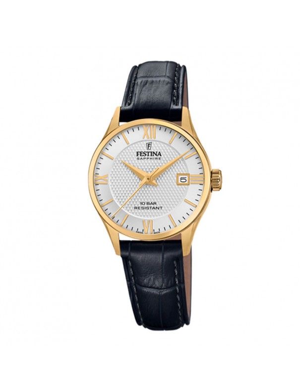 Reloj Festina Mujer Swiss Made F20011/1, analógico con segundero. Esfera de 29mm de diámetro con ventana de calendario, pulsera de piel y cristal de zafiro. Movimiento Simple Suizo. Caja en color dorado. Sumergible a 10ATM, por lo que es apto para ducha y baño con inmersión.